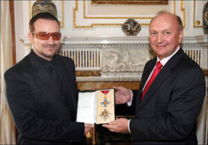 El 29 de marzo de 2007, Paul David Hewson, conocido mundialmente como Bono, el líder de la banda irlandesa U2, fue nombrado Caballero Honorario del Imperio Británico (KBE, por sus siglas en inglés). Esta distinción le fue otorgada por la reina Isabel II en reconocimiento a su contribución a la música y, especialmente, a su trabajo humanitario.
